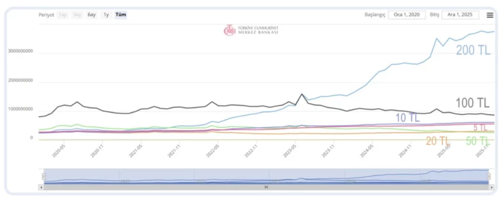 2023 Mayıs’ta 200 liralık banknotlar 100 liradan az olurken, 2023 Haziran ayındaysa 100 TL’lik banknotları geçerek 2,5 yılda farkı açtı. 2023 Mayıs’tan 2025 Aralık’a piyasaya sürülerek dolaşıma giren 200 TL’lik banknotların sayısı yüzde 218 oranında artarken, 3 milyar 757 milyon 345 bin 391 adede çıktı.