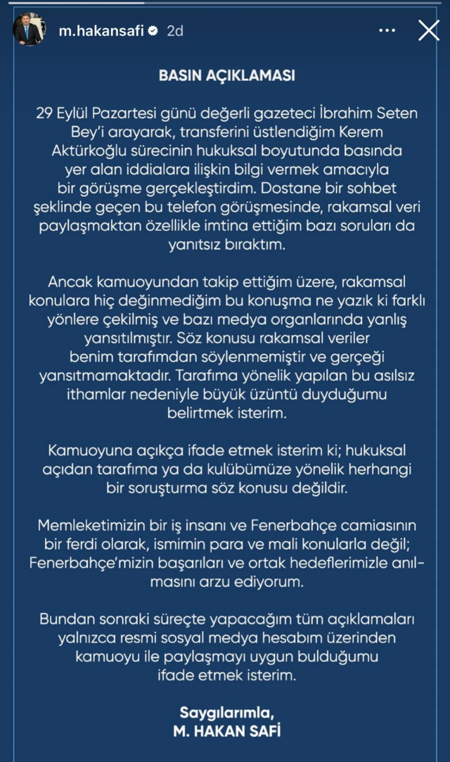 “29 Eylül Pazartesi günü Kerem Aktürkoğlu’nun transfer süreciyle ilgili yaptığım bir görüşmede sadece sportif konuları ele aldım. Ancak gördüğüm kadarıyla bu konuşma farklı şekilde yansıtılarak rakamsal verilerle ilişkilendirildi. Benim söylediğim rakamlar asılsızdır ve gerçeği yansıtmamaktadır. Üzüntüyle belirtmek isterim ki, medyada yer alan iddialar doğru değildir ve herhangi bir soruşturma söz konusu değildir.”