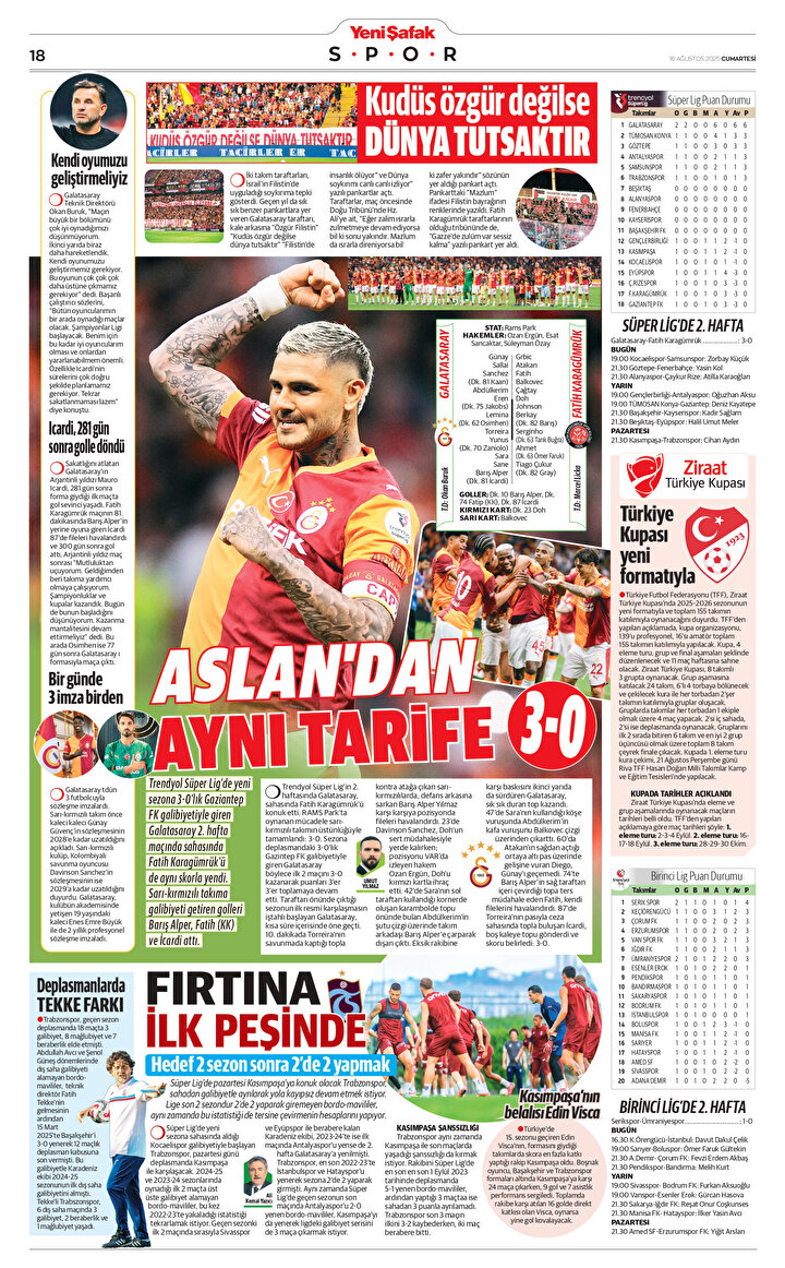 Trendyol Süper Lig’de yeni sezona 3-0’lık Gaziantep FK galibiyetiyle giren Galatasaray 2. hafta maçında sahasında Fatih Karagümrük’ü de aynı skorla yendi. Sarı-kırmızılı takıma galibiyeti getiren golleri Barış Alper, Fatih (KK) ve İcardi attı.