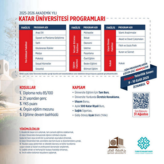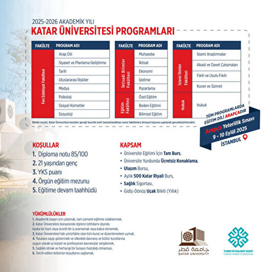 Ön kayıt sürecini tamamlayan ve gerekli şartları yerine getiren öğrenciler, Katar Üniversitesi tarafından 9-10 Eylül 2025 tarihinde İstanbul’da sözlü ve yazılı sınava alınacak. Sınavdan başarıyla geçen 30 öğrenci 2026 yılı ocak ayında Katar’da eğitimlerine başlayacak.